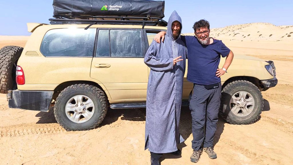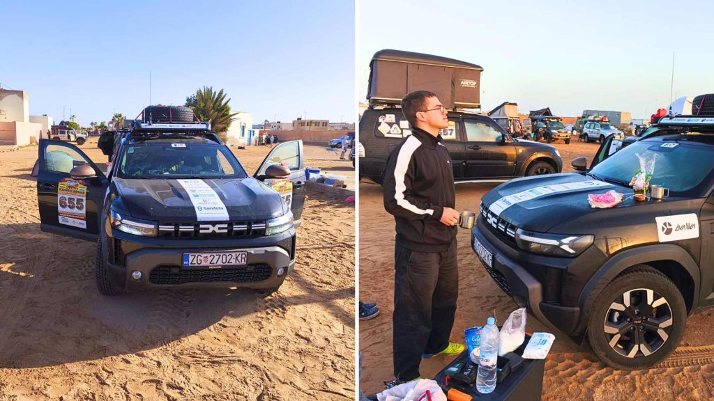 Prvo ipak idemo do bivka. Vođeni Orux Mapsom silazimo s asfalta u ravnu pustinju posutu dinama. Pratimo tragove guma i bijelo obojano kamenje koje služi kao orijentir. Na horizontu vidimo auto: Chris, naš pajdo s kojim dijelimo kontejner do Kopra. Izlazi iz stare Toyote, obučen u dželabiju, s dvojicom prijatelja iz Kazahstana.