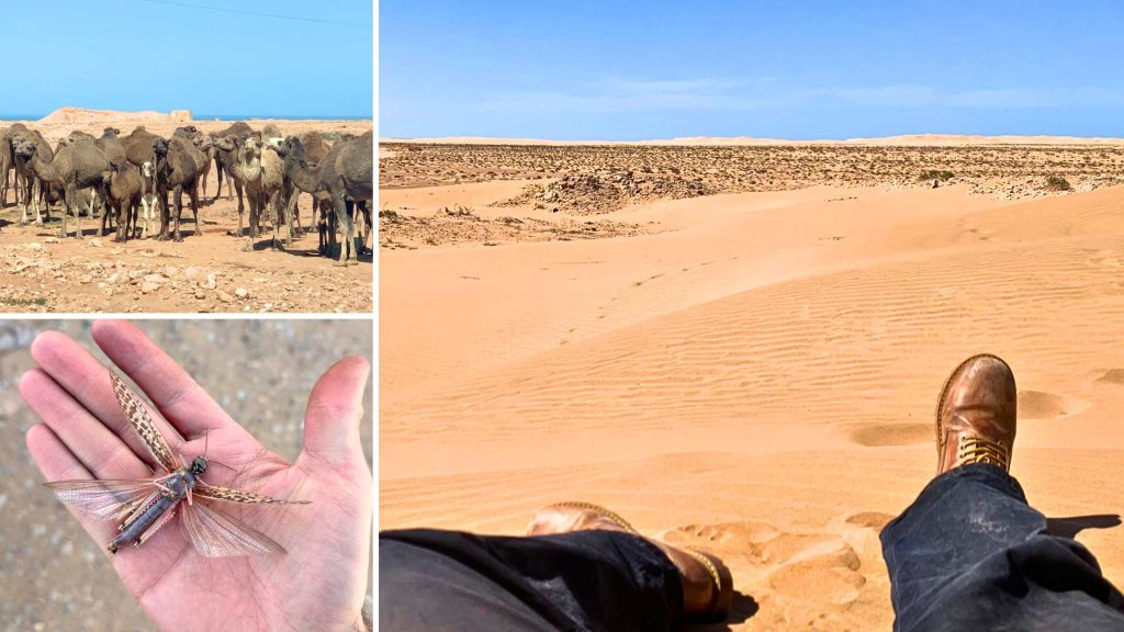 Na autocesti prolazimo kroz roj ogromnih letećih skakavaca, prizor koji još nisam doživio. Pogledali smo se i zapitali što to znači. Skakavci se zabijaju u hladnjake pa je jedan suputnik morao stati kod mehaničara na hitno čišćenje. Do Nouakchotta, jedne od sljedećih destinacija, tabla pokazuje 1500 kilometara. Preko WhatsApp grupe saznajemo da je slovenska ekipa jučer imala prometnu, bez ozlijeđenih, ali prekidaju avanturu. Mi nastavljamo dalje, polako i sigurno. Trideset stupnjeva, dezić drži drugi dan. Reklama nije lagala.
