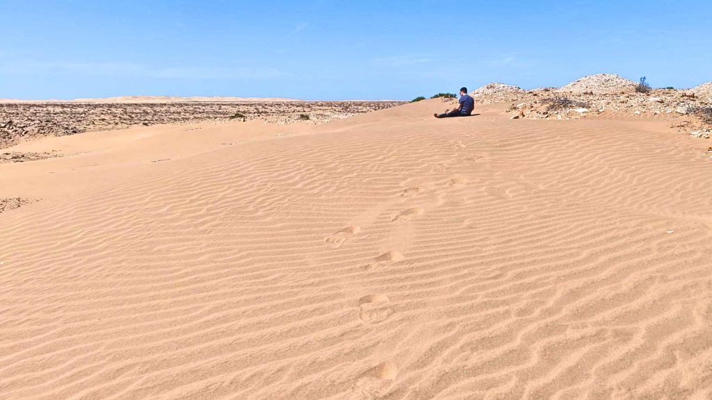 Srećom, Din je složio 150 sati playliste pa imamo izbor. “Take My Breath Away”, ili kako je mi zovemo “Dahiraj me”, ozbiljno konkurira za himnu ove avanture. Slušamo i lokalnu glazbu: Cheb Khaled, Cheb Mami i “Desert Rose” sa Stingom. Ta pjesma legne na ovaj pejzaž zapadne atlantske obale kao budali šamar. Jedina razlika između mene i Stinga je u prijevozu, njega je vozila fatalna žena u čistom Jaguaru, mene Din u prašnjavoj Daciji.