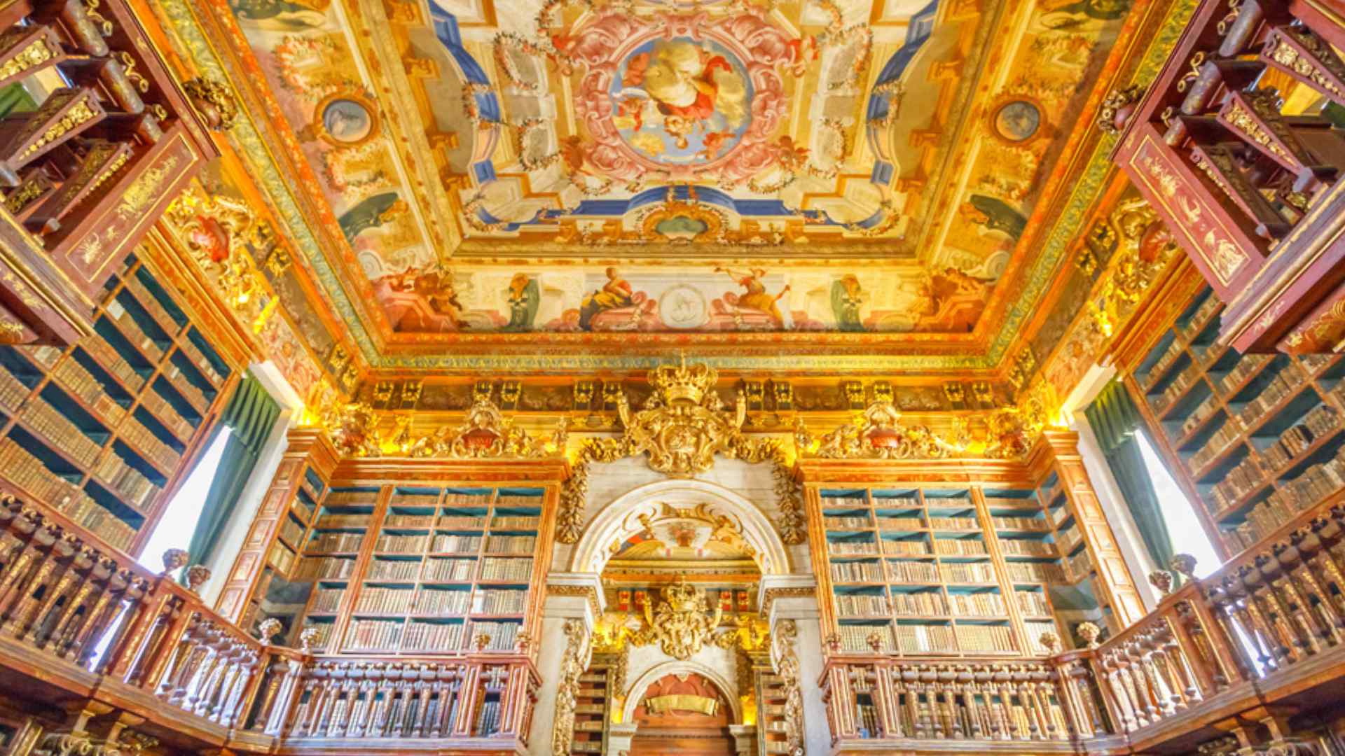 • Stropne freske: Slikari António Simões Ribeiro i Vicente Nunes oslikali su stropove tehnikom trompe l’oeil, stvarajući iluziju dubine i prikazujući alegorije znanosti, vjere i kraljevske moći.